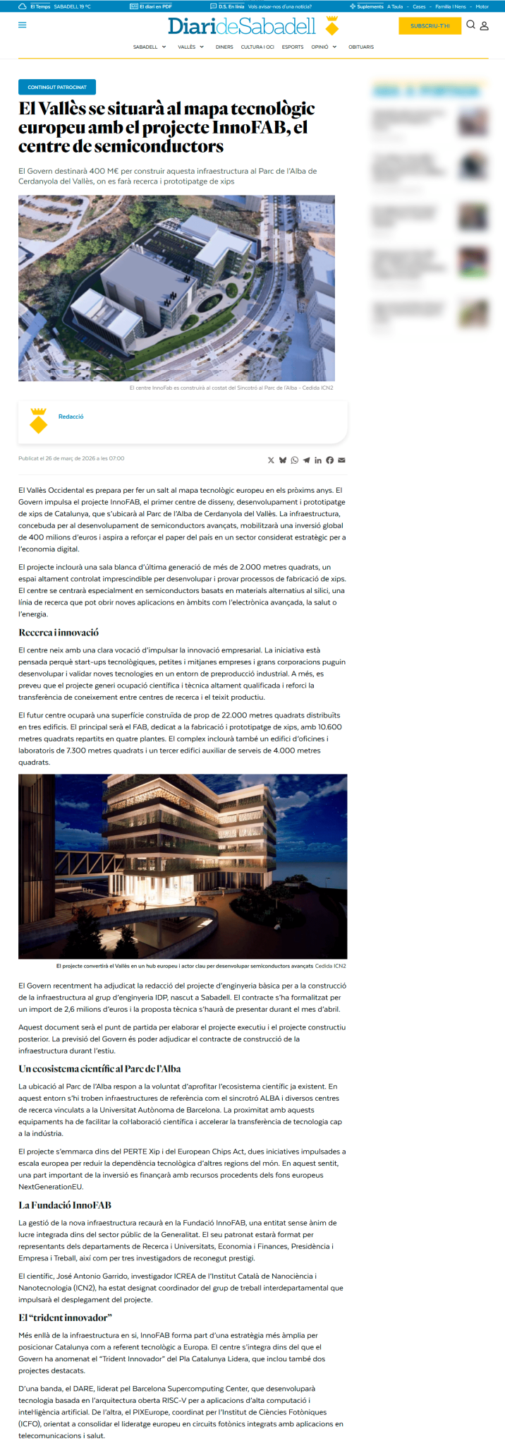 Home>Medios de Comunicación> The Vallès region will put itself on the European technology map with the InnoFAB project, the semiconductor center