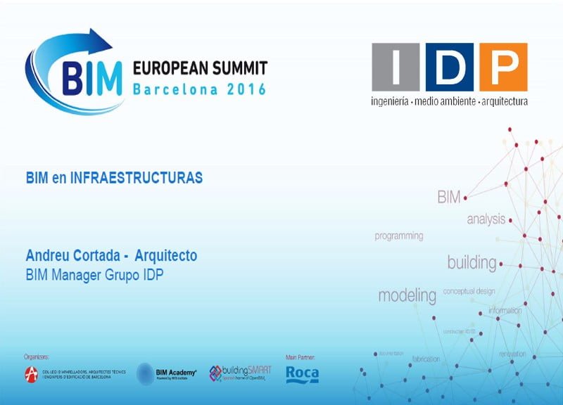 IDP, representada por el Sr. Andreu Cortada, BIM Manager del Grupo IDP, participa en esta segunda edición en la sesión Infraestructuras BIM donde expondrá el valor añadido en la realización de proyectos mediante metodología BIM siendo más notable su repercusión en la Obra Civil tanto por su impacto económico como por su gestión intensiva a lo largo de la vida útil de los equipamientos públicos.